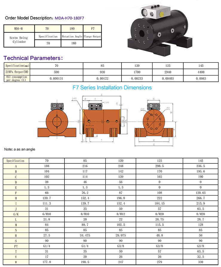 F7系列螺旋擺動(dòng)油缸為底腳式安裝,帶防暴管平衡閥,結(jié)構(gòu)緊湊,外觀合適。安裝方便,普遍應(yīng)用于各種工程機(jī)械及翻轉(zhuǎn)機(jī)構(gòu),與進(jìn)品F7系列1:1互換使用。